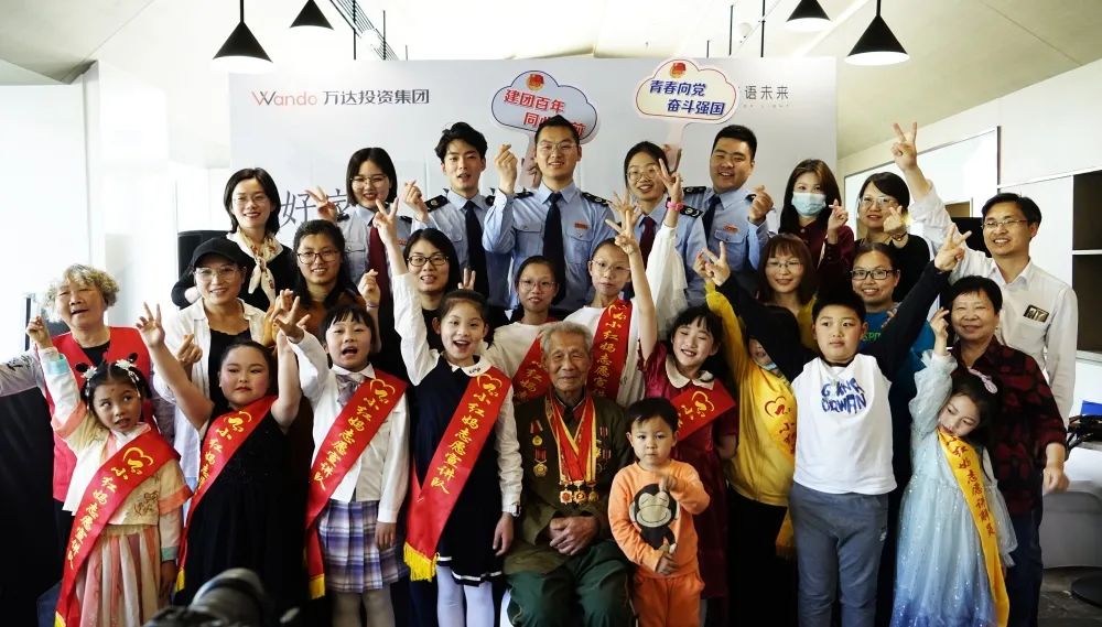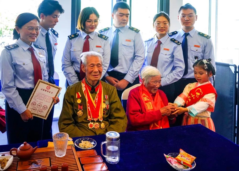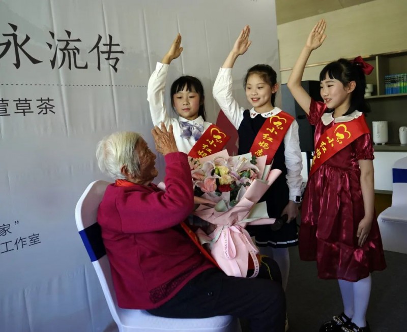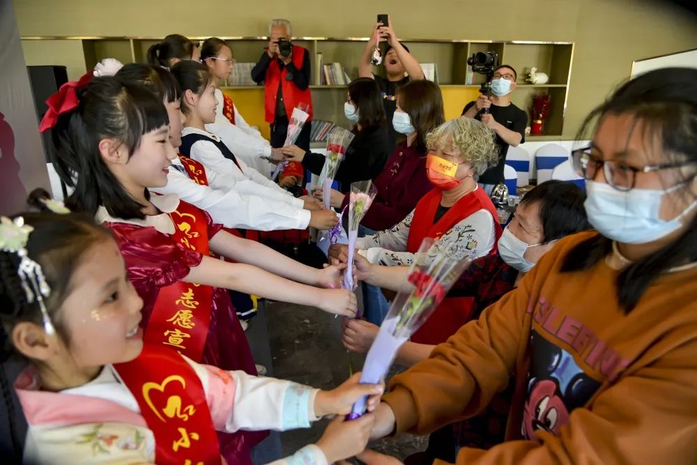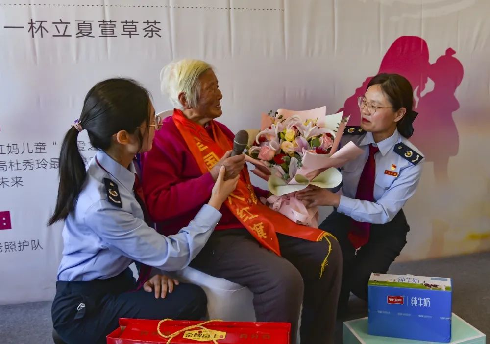 区税务局最美家庭工作室志愿者薛留云、王姝懿、杜秀玲给全国老三八红旗手献花,红妈宣讲员陈奕涵、汤佳钰、卢景彤向万奶奶敬少先队队礼,献祝福语:“万奶奶,祝您母亲节快乐!我们将传承光荣传统,做好新时代接班人!”