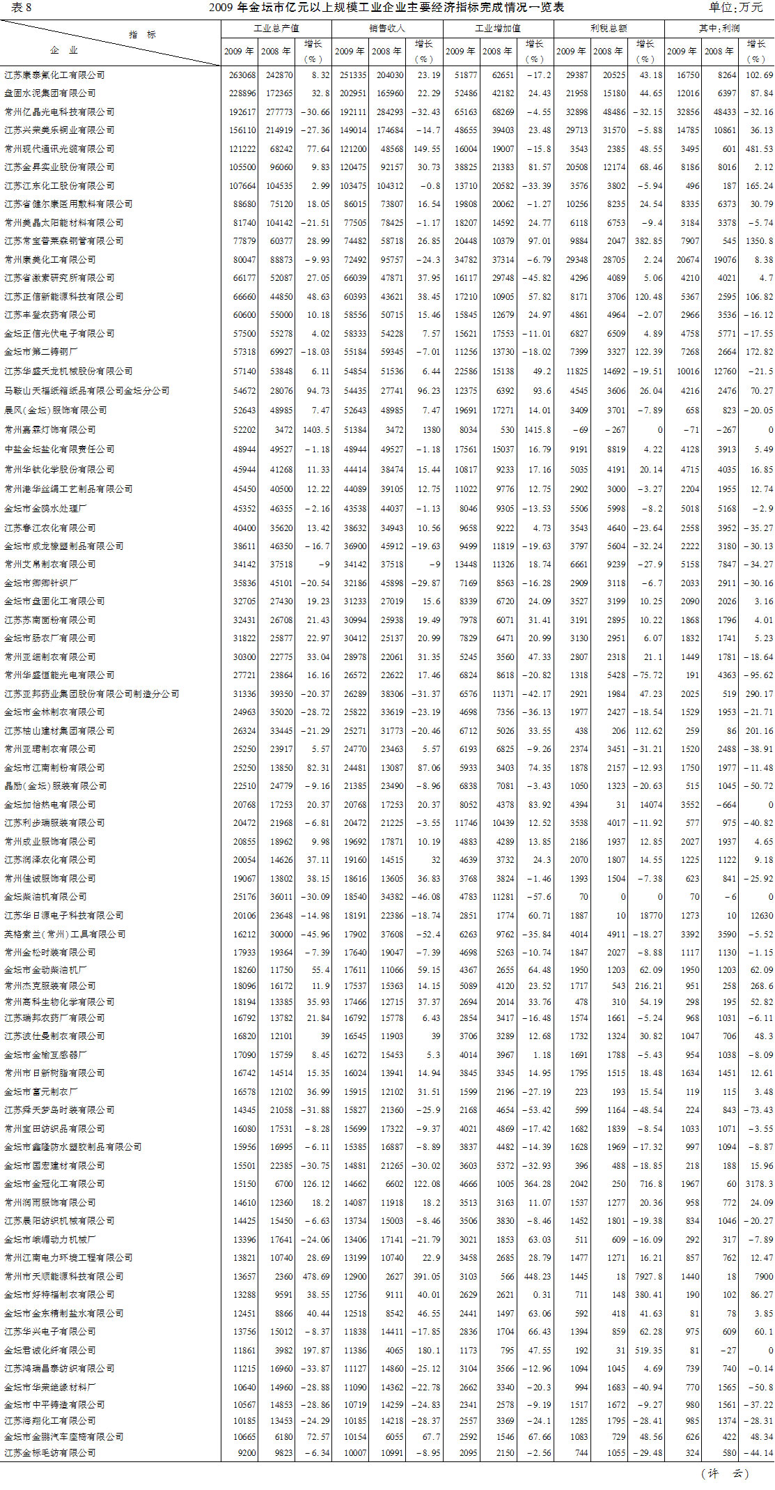 表8 2009年金坛市亿元以上规模工业企业主要经济指标完成情况一览表
