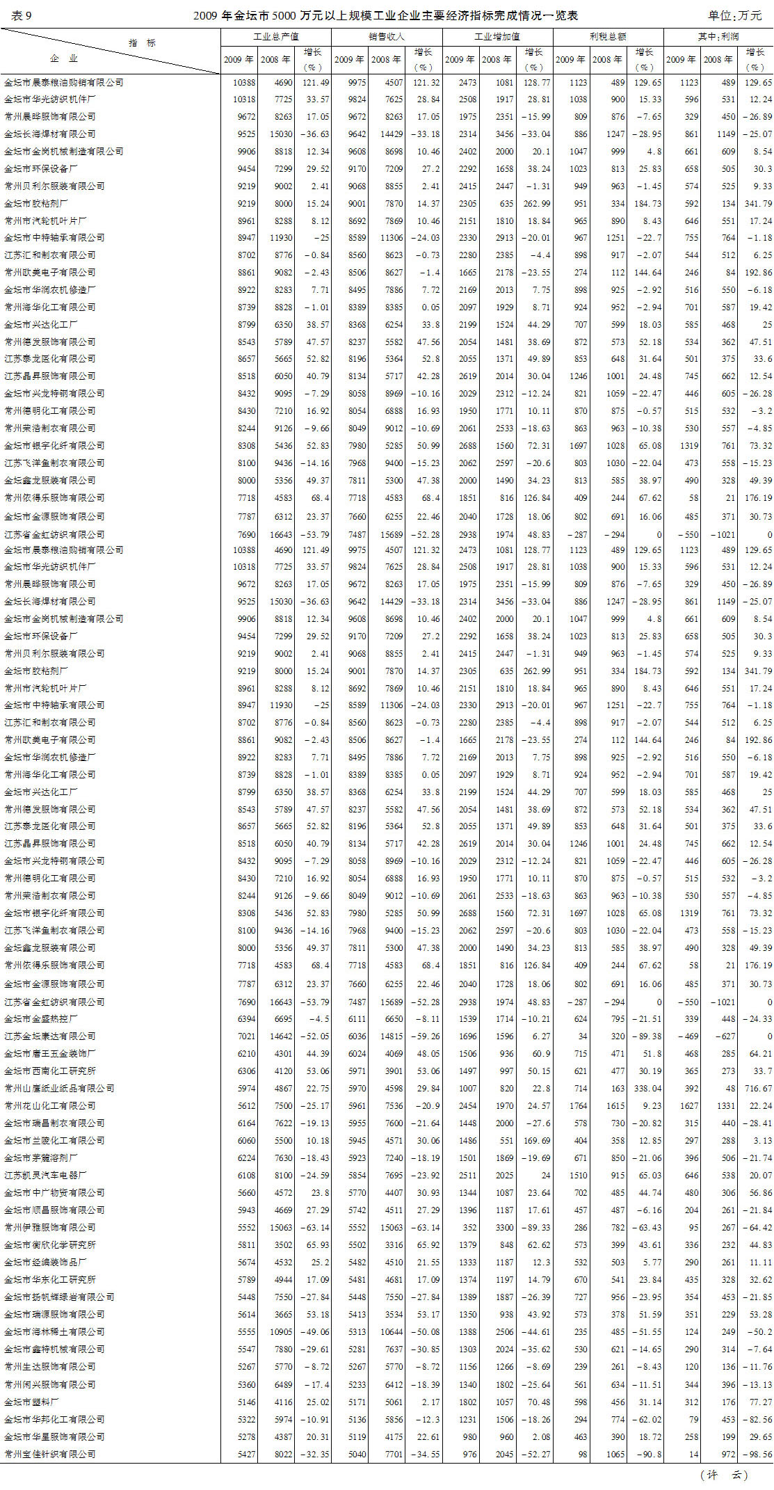 表9 2009年金坛市5000万元以上规模工业企业主要经济指标完成情况一览表