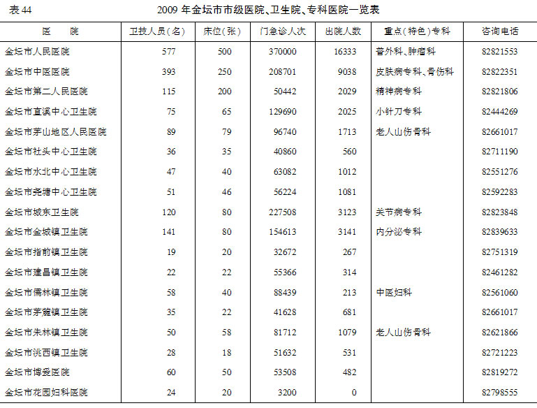 表44 2009年金坛市市级医院、卫生院、专科医院一览表