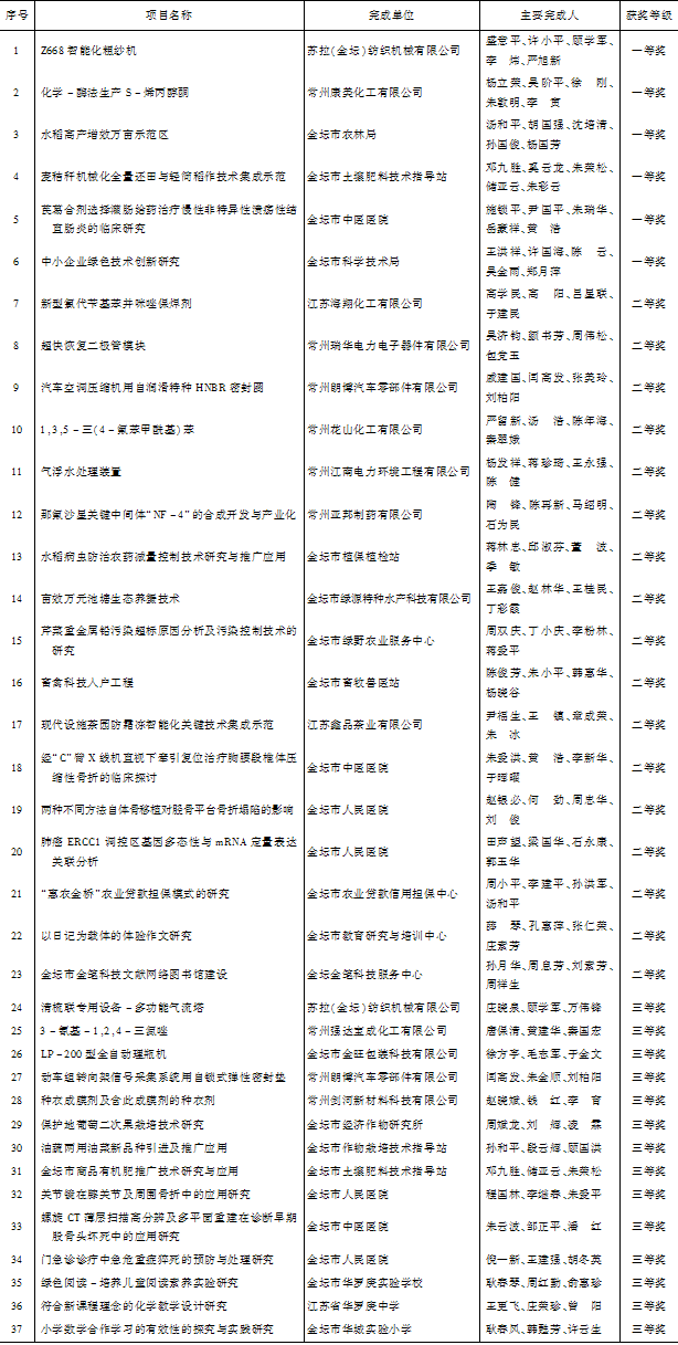 表27 2010年度金坛市科技进步奖获奖项目一览表