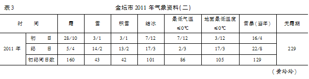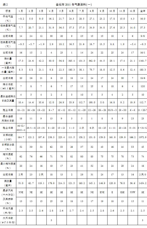 【气候】 金坛市2011年总的气候特点是气温、降水、日照均正常。年平均气温16.0℃;年极端最高气温37.3℃;年极端最低气温-9.5℃;全年35℃及以上的高温日数12天;年内1月温度异常偏低,偏低值达2.9℃、11月温度异常偏高,达4.0℃。年总降水量1161.7毫米,其中1~4月份降水量显著偏少,11月异常偏少,6、8月异常偏多,8月偏多200.2%;6月14日本地入梅,7月21日出梅,梅长37天,梅雨量450.5毫米,比常年多86%,属异常偏多年份。年日照时数1972.9小时。全年雷暴发生正常、结束偏早,低温雨雪冰(霜)冻影响程度一般,夏季高温天气不明显,主要出现在7月,年内暴雨日为6天,集中在6、8月,最大值180.3毫米,大雾、台风(大风)影响弱,春季干旱程度大。