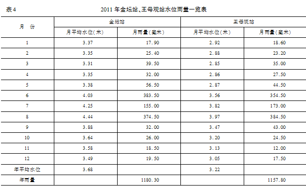 2011年金坛市汛期总体形势为先旱后涝。自2010年10月至2011年6月中旬,全市出现秋冬春连旱,降雨持续偏少,出现较严重旱情。金坛站4月最低水位为3.17米。全市共有8个镇(区)51个村受干旱影响。作物受旱面积1.27万公顷,因旱饮水困难人口0.96万人。4座水库干涸。此次受旱情影响比较严重的有尧塘镇和薛埠镇。因旱造成直接经济损失0.31亿元。