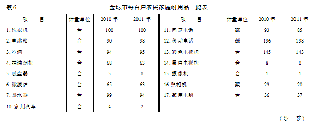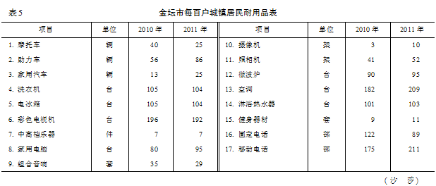【城镇居民生活】 据金坛市100户城镇居民家庭抽样调查资料显示,2011年,全市城镇居民人均总收入29982元,同比增长15.9%。其中,人均可支配收入28087元,同比增长17%,家庭人均消费支出18528元,同比增长23.4%。