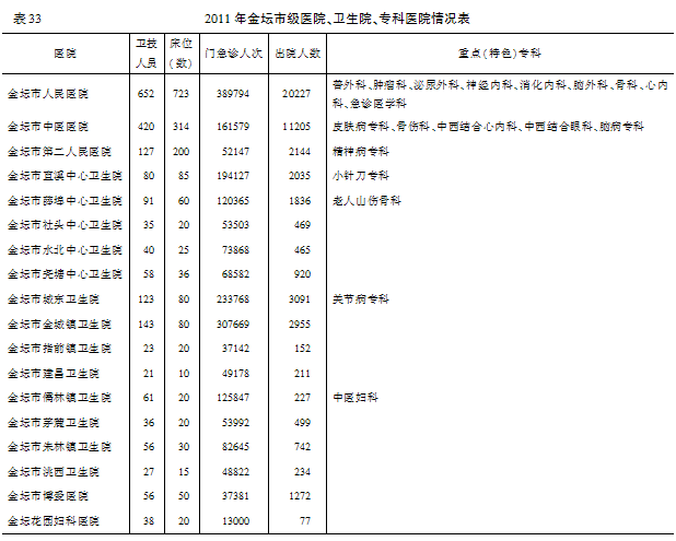 2011年,金坛市卫生系统自主和公开招聘医卫类工作人员101名,新增固定资产25933万元。年末,全市有医疗卫生机构176所。政府办卫生机构152家(医院3家、社区卫生服务中心2家、乡镇(中心)卫生院11家、社区卫生服务站121家,其他39家),非政府办企事业单位医务室(卫生所)13所,民营医院2所,个体诊所9所。全市实有标准床位1845张,平均每千人拥有床位3.34张。卫生从业人员2952人,其中卫技人员2587人,每千人拥有卫技人员4.69人,每千人拥有医生2.5人。全市镇级以上医疗机构全年诊疗229.87万人次,其中门急诊205.3万人次、住院4.74万人次。市财政投入卫生事业经费1.3亿元,全市医疗卫生机构固定资产总额4.8亿元。