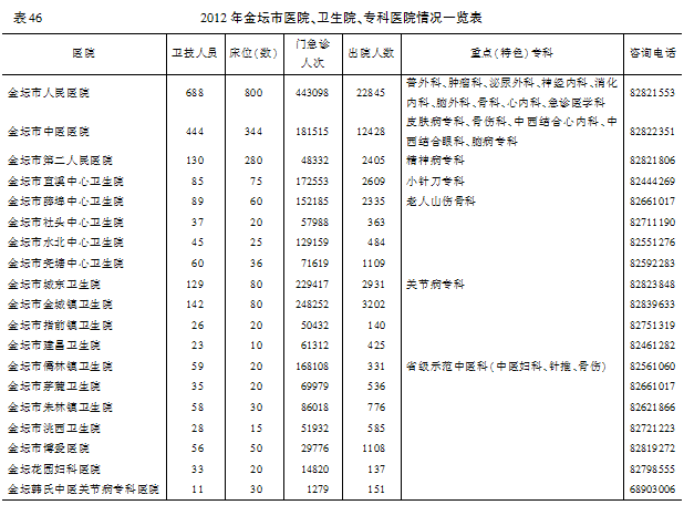 2012年,金坛市卫生系统深入推进医药卫生体制改革,全面深化卫生惠民工程,大力加强基础设施建设,不断提升公共卫生服务和医疗服务水平,为促进经济社会全面发展提供有力保障。全年门急诊222.1万人次,住院5.4万人次。基层医疗卫生机构零差价药品销售7781万元,让利幅度33%。同时,在医学博士生和卫生省级科研课题实现零的突破。全年自主、公开招聘医卫类工作人员116名。年末,全市拥有各级各类医疗卫生机构213家,全市有编制(实有、标准)床位1938张。其中,市级医院1347张;乡镇卫生院(社区卫生服务中心)491张;其他医院100张。平均每千人拥有床位3.45张。全市卫生技术人员2336人。其中,执业(助理)医师1166人(含乡镇村医执助59人);注册护士859人;公共卫生人员161人;其他人员150人。千人拥有医生数1.85人,千人拥有护士数1.52人。市财政投入卫生事业经费1.9亿元。