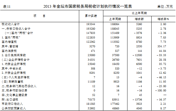 【概述】 2013年,江苏省金坛市国家税务局(以下简称市国税局)围绕“服务科学发展,共建和谐税收”这一主题,在确保组织收入增长、发挥税收政策职能的基础上,全面提升税收管理水平、办税服务效能和国税部门形象,圆满完成各项工作任务。全年共计组织各项税收收入193344万元,同比增收5260万元,增长2.8%;完成公共财政预算收入52902万元,同比增收4040万元,增长8.27%,为经济社会发展提供财力保障。