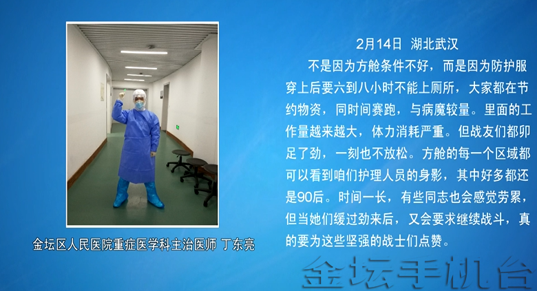 “2月16日,参加战斗的队员说病人相对比较安稳。”区人民医院重症医学科主治医师丁东亮在日记中写道。“在方舱工作的这几天,所有的队员都穿着纸尿裤。不是因为方舱条件不好,而是因为防护服穿上后要长时间不能上厕所。大家都在节约物资,同时间赛跑,与病魔较量。”