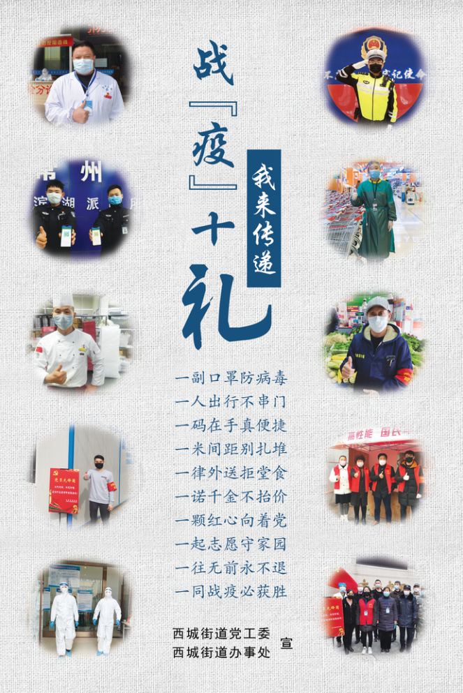 当前,新型冠状病毒肺炎疫情进入关键时期,要取得这场战役的最后胜利,不仅需要街道全体党员干部、物业工作人员、志愿者等坚守岗位、奋战一线,更需要广大居民朋友共同参与、从我做起,用真心、用温情、用坚守、用行动,合力守护我们的家园。为此,西城街道党工委、办事处推出“战‘疫’十礼”,倡议广大居民朋友共同传递,守护健康!