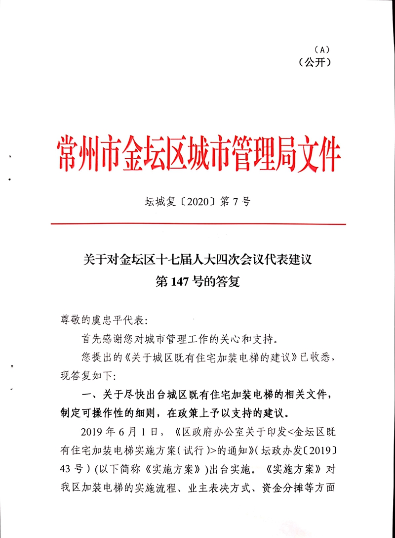 关于对金坛区十七届人大四次会议代表建议第147号的答复