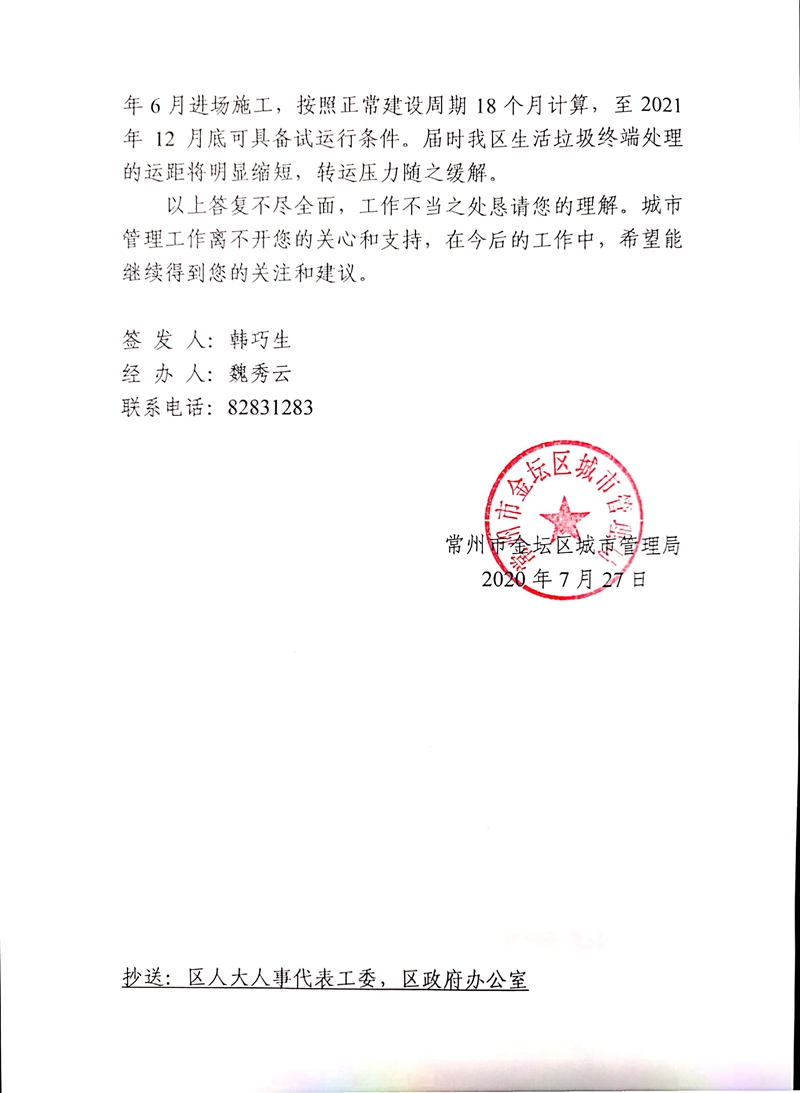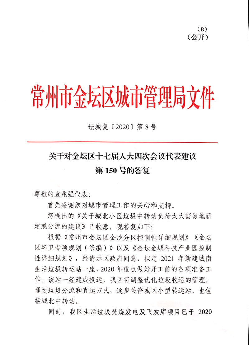 关于对金坛区十七届人大四次会议代表建议第150号的答复