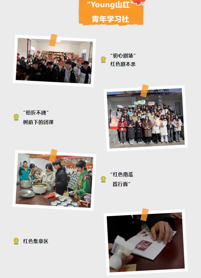 金坛团区委打造“Young山红”青年学习社线路,设置“初心剧场”红色剧本杀,开展“柏折不挠”树荫下的团课,品尝“红色南瓜践行面”,设置红色集章区,通过全程的情景再现,带领高校学子跟随先辈的脚步重走红色阳山路。
