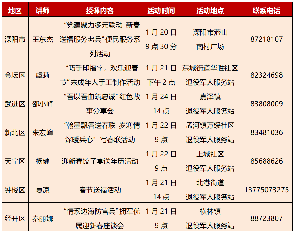 为认真贯彻落实习近平总书记关于退役军人工作的重要论述,将全市1078个退役军人服务中心(站)由“建起来”向“用起来”转变,自2024年1月15日起,全市退役军人服务保障系统将为广大退役军人和人民群众提供各类服务项目。为进一步扩大活动范围和影响力,现已增加至6大类183小项,内容涉及政策宣传、生活健康、关心关爱、志愿服务、创业培训、体育竞赛等。每周三将在“常州市退役军人事务局”微信公众号上发布下一周服务清单,热烈欢迎广大退役军人和人民群众前往参与。