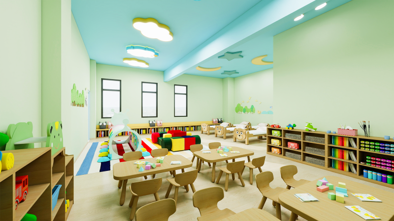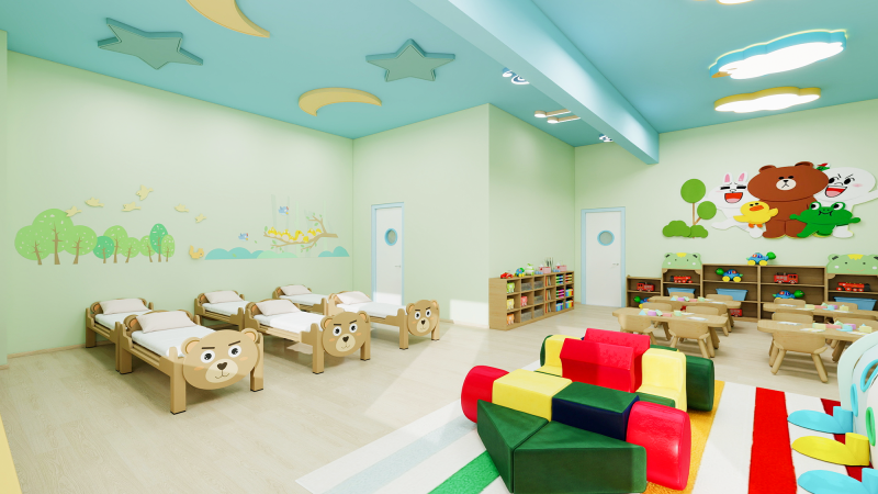 依托专业团队,设计了符合婴幼儿身心发展规律的多样化课程,涵盖语言、艺术、运动、社交等领域。通过游戏化、体验式教学激发幼儿潜能,促进早期综合发展。室内设置手工墙、绘本架与卡通装饰,让这里不仅是托育空间,更是启蒙教育的温暖起点。