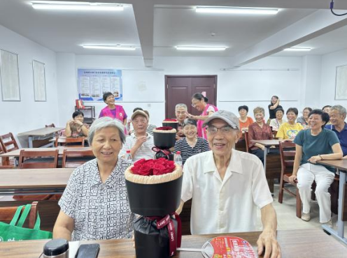 活动伊始,志愿者娓娓道来牛郎织女的美丽传说,详细介绍了乞巧、拜织女、观星、吃巧果等核心习俗,让老人们深刻理解“中国情人节”。现场还请来三对金婚夫妻,他们与大家分享年轻时的浪漫往事,讲述着对家人的祝福,邻里间的距离在不知不觉中拉近。随后,工作人员还为每对金婚夫妻送上象征爱与尊敬的玫瑰花,并为他们拍摄了喜庆的“喜”字纪念照。“结婚这么多年了,我们老两口还没拍过像样的合影,那时候哪有现在这样好的条件,这回终于拍了,感谢社区!”镜头前,“靠近一点,笑一笑,非常好……”伴随着摄影师的指导,镜头里的身影或坐或站、相互依偎,脸上都洋溢着幸福的笑容,将老人们相濡以沫的爱情定格在最美好的瞬间。老人们脸上洋溢着幸福的笑容,仿佛重回青春岁月。