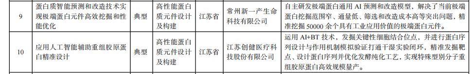 此次入选的案例分别为常州新一产生命科技有限公司的“蛋白质智能预测和改造技术实现极端蛋白元件高效挖掘和性能优化”案例和江苏创健医疗科技股份有限公司的“应用人工智能辅助重组胶原蛋白精准设计”案例。