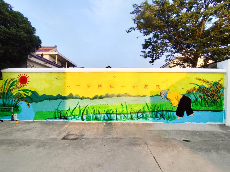 师生们手持画笔与调色盘,俯仰其间,勾勒涂抹,将一片赤诚与巧思凝于墙绘创作之中。围绕“红色文化”与“和美乡村”两大主题,倾情绘就《田园风光》《荷间乡韵》《花篱绘梦》《青春心向党,奋进新征程》等大型墙绘作品。明丽的色彩诉说乡土新变,深远的意象勾勒振兴图景,让原本素净甚至斑驳的墙面,蜕变为传递美、承载情的艺术载体。