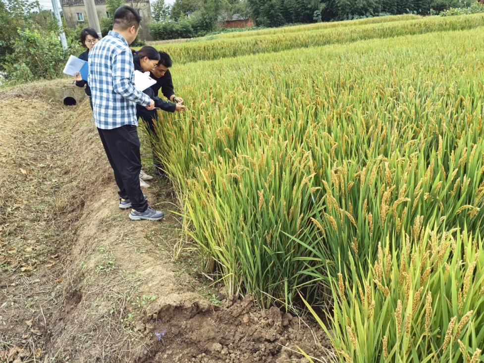 金秋十月,丰产村稻田稻穗满枝,沉甸甸的稻穗随风摇曳,水稻长势喜人。近日,金坛区农业农村局专业考评组赴丰产村开展水稻优质片区现场考评工作,通过实地核查、台账核验与技术指导,为秋粮提质增收提供支撑。