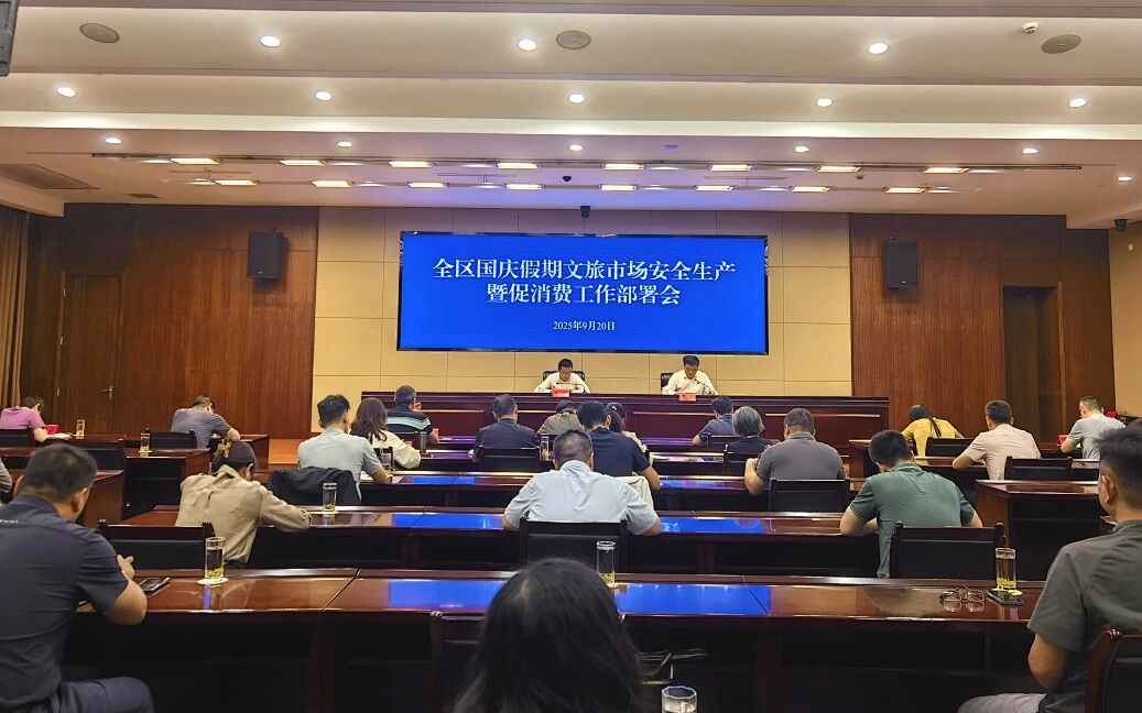 副区长杨波在讲话中强调:一要提高思想认识,切实增强做好国庆假期文旅市场安全工作的责任感与紧迫感;二要强化部门协同,形成工作合力,突出抓好重点领域监管、投诉高效处理、舆情及时回复、宣传引导联动;三要健全组织保障,系统化部署、体系化推进、智慧化赋能、规范化管理,全面提升安全生产治理能力和水平;四要加强活动策划,紧扣“逍遥”主题做好活动策划与效果评估,深入摸排经营主体活动,加强节前市场督导和服务。
