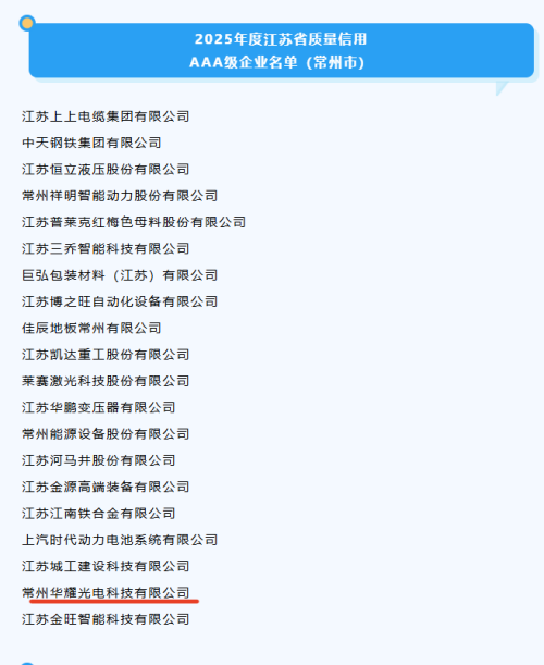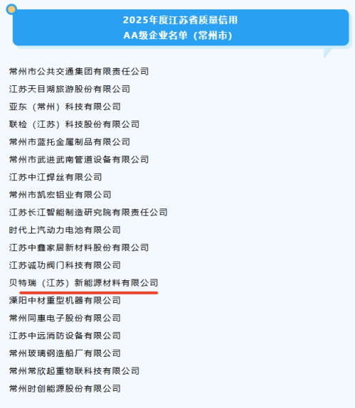 在质量信用体系建设方面,常州华耀光电科技有限公司获评2025年度“江苏省质量信用AAA级”,贝特瑞(江苏)新能源材料有限公司获评“江苏省质量信用AA级”,体现出企业在诚信经营、质量保证、社会责任等方面的优秀表现。