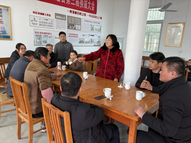 得知情况后,村委会工作人员第一时间邀请双方前往村法治茶馆,双方坐下来,围着一张茶桌,泡上一壶热茶,在村干部、组长、老党员和法律顾问的见证下,以柔性智慧破解邻里矛盾难题。调解员们用通俗易懂的语言拆解双方的诉求,引导双方换位思考,摆事实、说依据、明利害,一杯“杠茶”的功夫,一场僵持不下的邻里纠纷便得以妥善化解。
