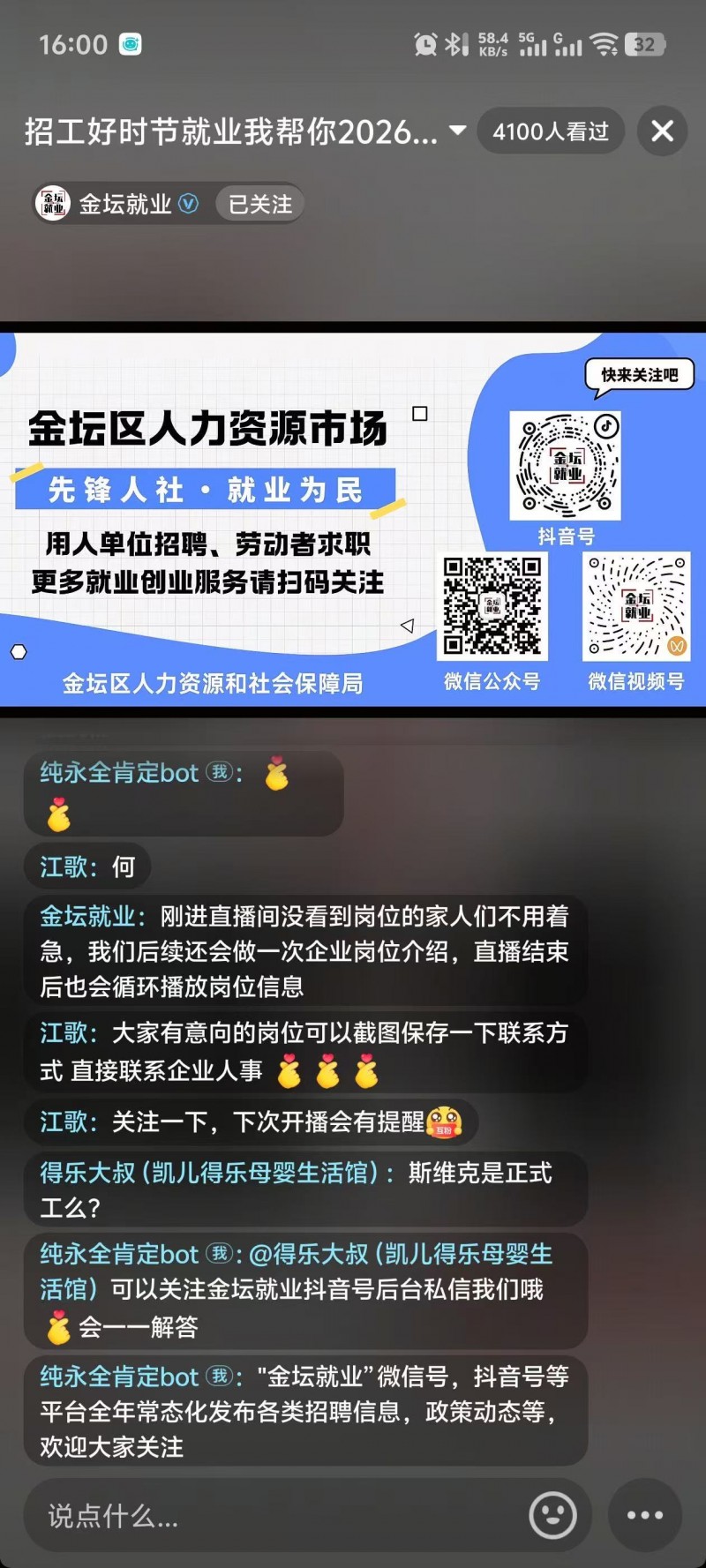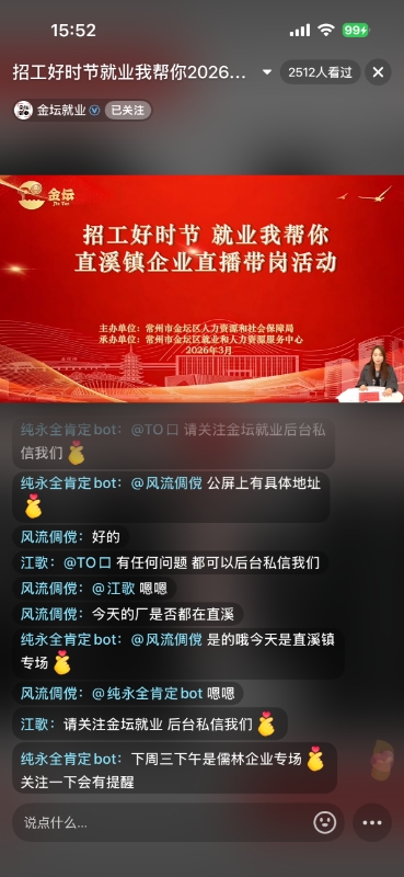此次直播带岗活动,是区人社部门扎实推进稳就业、保用工工作的生动缩影。春招启动以来,区人社局始终坚持“联动发力、精准赋能、便民高效”的工作理念,推出一系列多元化就业服务举措,全方位护航企业发展与群众就业。依托线上平台搭建“职等你来”公益招聘专栏,联合区融媒体中心常态化免费发布招聘信息,截至目前已为70余家用人单位推送岗位近5000个,专栏浏览量超10万人次;同时,聚焦失业人员、就业困难人员等重点群体,区人社局通过短信推送、政务服务窗口宣讲、村社网格通知等多种形式,精准推送岗位信息与就业扶持政策,同时依托“金坛就业”微信公众号整合各类岗位资源,简化求职流程,大幅提升就业服务便捷度。